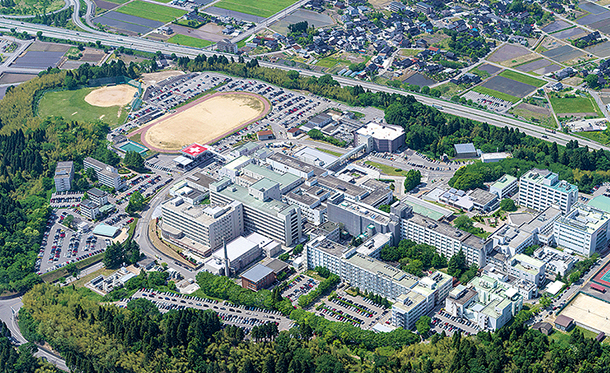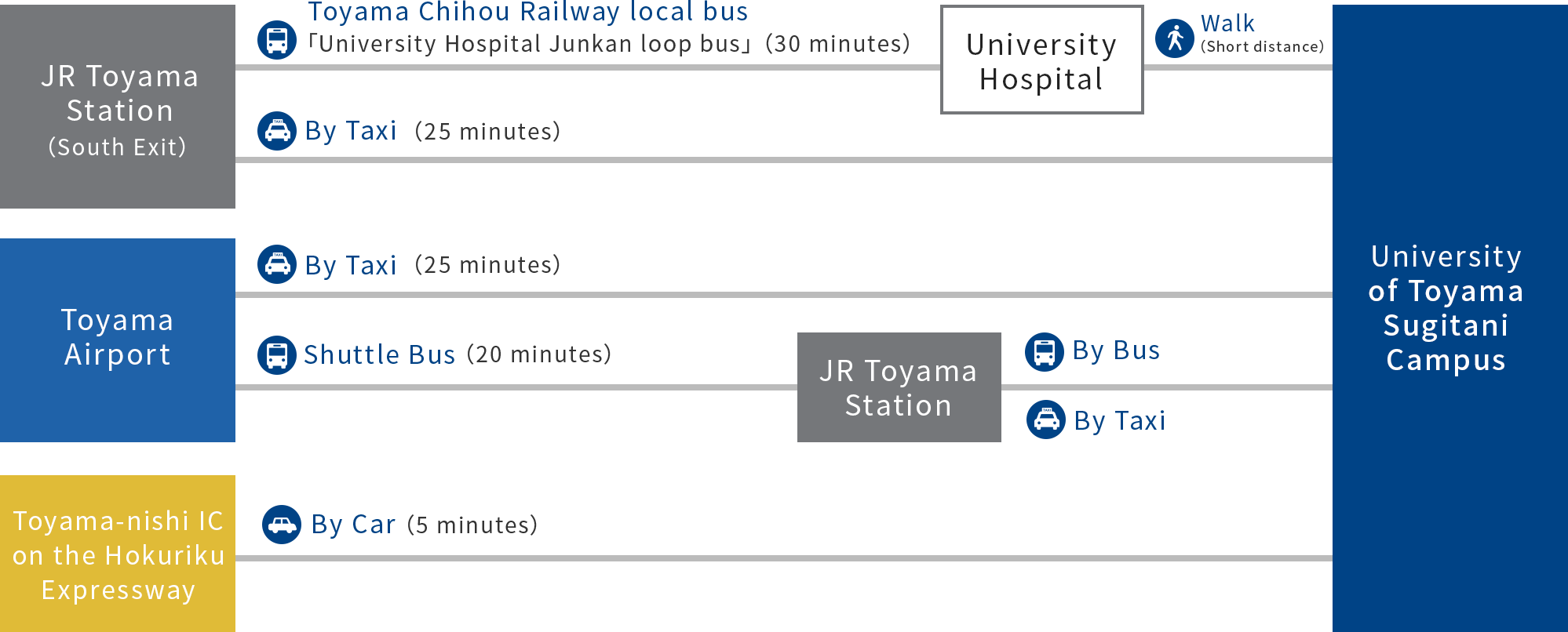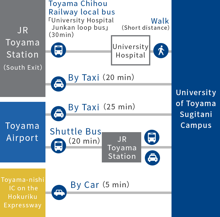 From bus platform 4 of the bus terminal outside of the South Exit of JR Toyama Station, board a Toyama University Hospital Junkan loop bus (Toyama Chihou Railway local bus), and get off at the Toyama University Hospital bus stop (30-minute ride, ¥460)