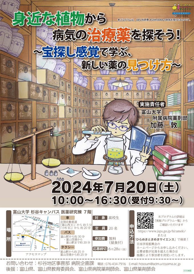 富山大学附属病院薬剤部では、令和6年7月20日(土)に「ひらめき☆ときめきサイエンス~ようこそ大学の研究室へ~KAKENHI」を実施します。「ひらめき☆ときめきサイエンス~ようこそ大学の研究室へ~KAKENHI」とは、大学などの研究機関で行っている科学研究費助成事業の研究成果をもとに、小学校5・6年生、中学生、高校生を対象に、直に見る、聞く、ふれることで、科学のおもしろさを感じてもらうプログラムです。全国の大学や研究機関が、科学の楽しさ、難しさ、不思議に触れられるよう、いろいろなプログラムを用意しています。