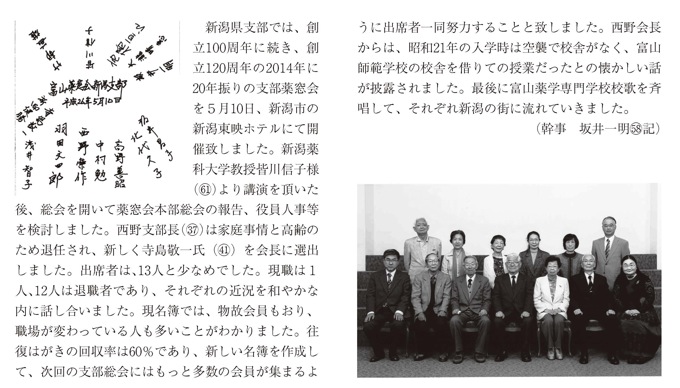 その後、富山市で3月に行われた薬窓会の活動を新潟県支部長の寺島さん(㊶)より報告をいただきました。2年前の総会で出席者が13名だったので、今回は、電話作戦により、3名多い16名の出席となりました。特に、現役が少ないということで、現役、2年目の木村優佑様(101回卒)に出席していただきました。
