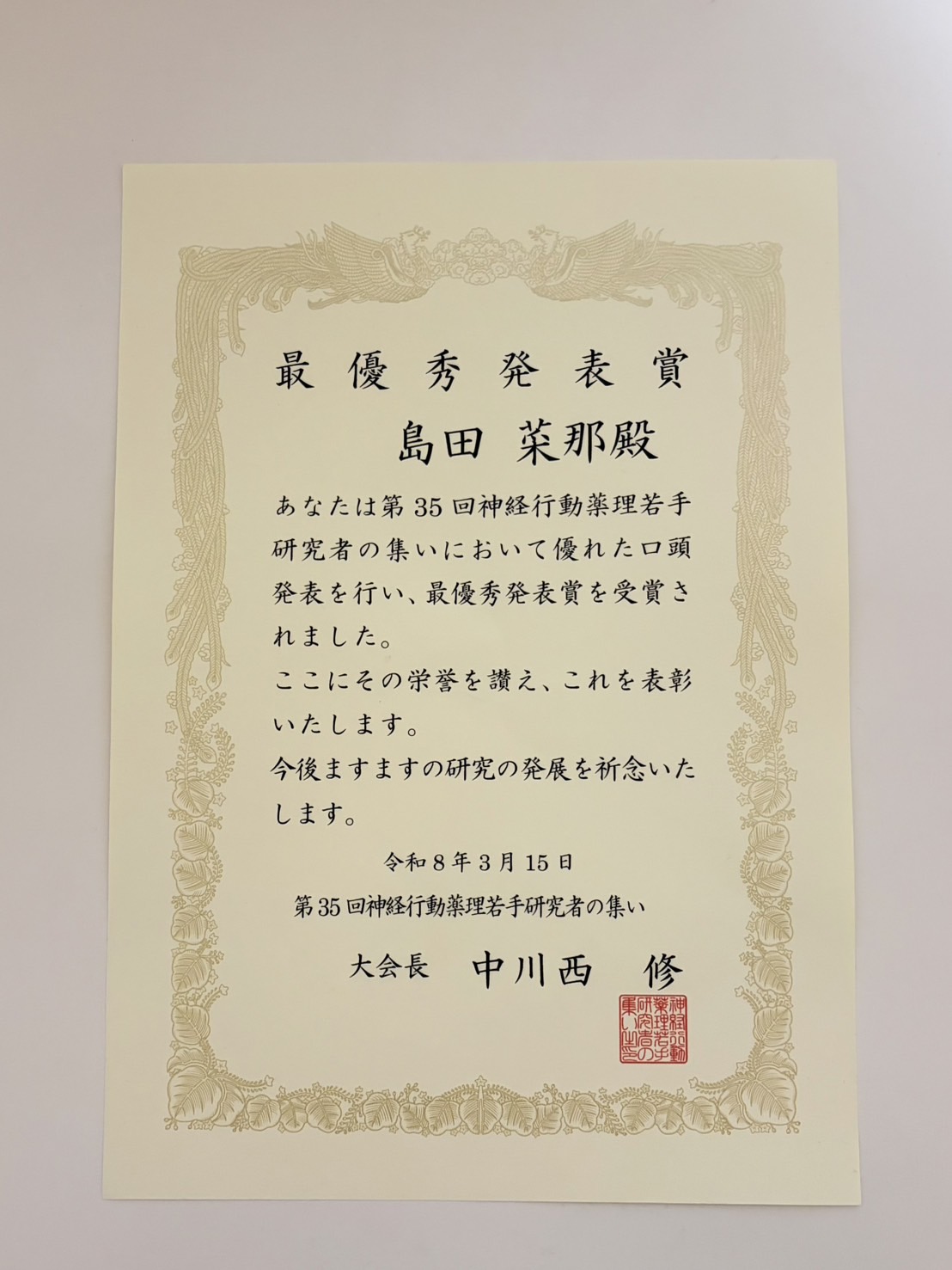 第35回神経行動薬理若手研究者の集い:最優秀発表賞.